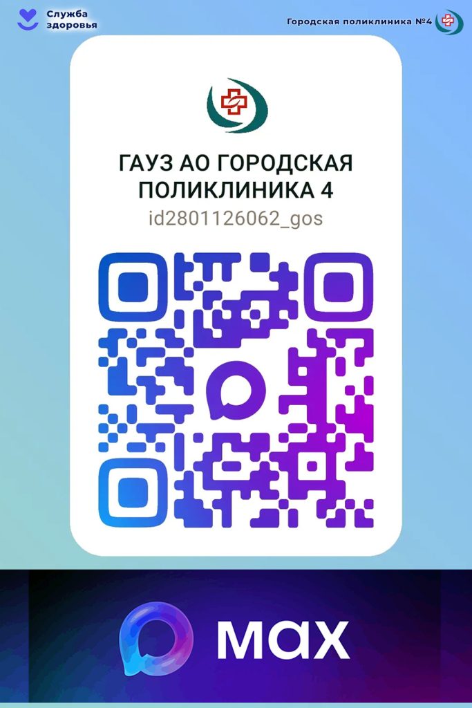 Перейдите по ссылке: https://max.ru/id2801126062_gos , QR-коду или найдите нас в мессенджере «МАХ» по названию: ГАУЗ АО ГОРОДСКАЯ ПОЛИКЛИНИКА 4