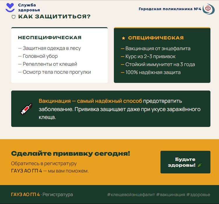В рамках прививочной кампании 2026 года вакцинация от клещевого энцефалита проводится в нашей поликлинике. Для получения прививки достаточно обратиться в регистратуру ГАУЗ АО ГП 4. Наши специалисты проконсультируют вас и ответят на все вопросы.