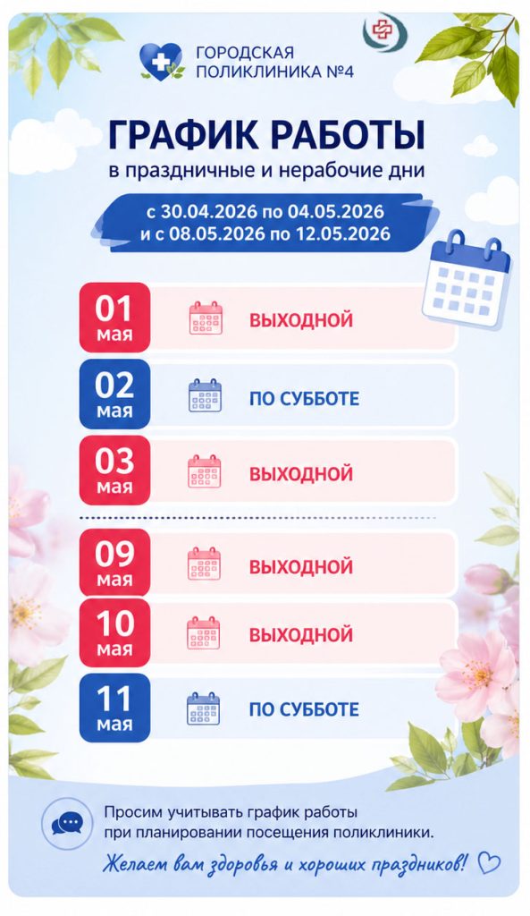 Сообщаем график работы поликлиники в нерабочие и праздничные дни с 30 апреля 2026 года по 4 мая 2026 года и с 8 мая 2026 года по 12 мая 2026 года.